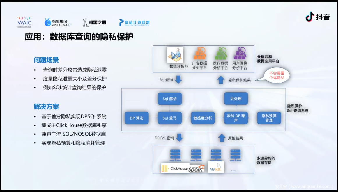 为了解决统计查询以及用户数据采集场景中的隐私泄露问题,Jeddak基于差分隐私技术,实现数据脱敏和隐私度量,自研了面向查询保护的 DPSQL (Differentially Private SQL Query Service)服务,将差分隐私计算应用到数据的SQL查询中,比如与ClickHouse数据库结合,实现统计查询的差分攻击保护。