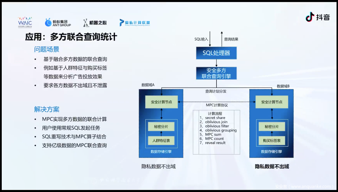 在面对需要利用多方数据进行联合查询时,Jeddak-MPC也有不俗实力。比如一方拥有人群的特征数据,另一方拥有购买标签数据,需要联合分析广告的投放效果。首先MPC的底层实现对用户是透明的,用户通过使用常规的SQL发起任务,Jeddak将SQL重写技术与MPC算子结合,从而实现在各方数据均不出域的情况下实现联合查询,目前Jeddak-MPC已支持亿级的联合查询。