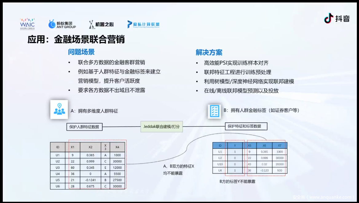 同时,在金融领域的联合营销案例中,需要基于人群特征和金融标签两方数据建立营销模型,实现存量客户促活。Jeddak-FL提供了丰富的算法协议支持,以及完整的联邦学习任务。首先通过高性能PSI来实现训练样本的对齐,用联邦特征工程进行训练预处理,之后利用树模型/深度神经网络来实现联邦建模,最后通过离线或在线预测的方式进行打分和投放,实现在保护各方数据不出域情况下的营销闭环。