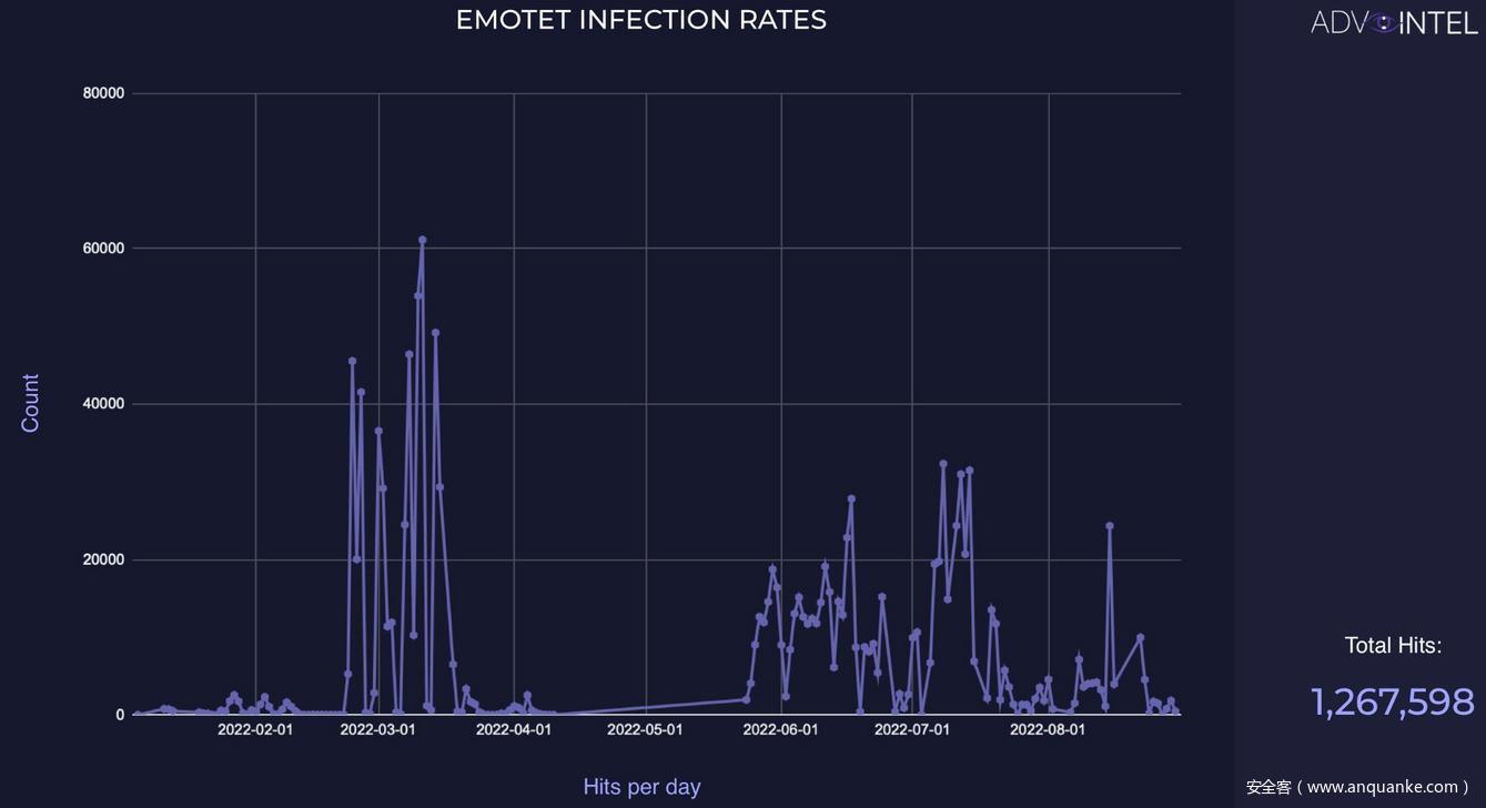 安全研究人员还指出,现今Emotet僵尸网络已成为网络犯罪集团的“供应商”,多数持续攻击初期动作均以Emotet僵尸网络为媒介或跳板。ESET此前曾发布报告称,与2021年9月至12月的前四个月相比,2022年前四个月的Emotet检测量增加了100倍。[阅读原文]