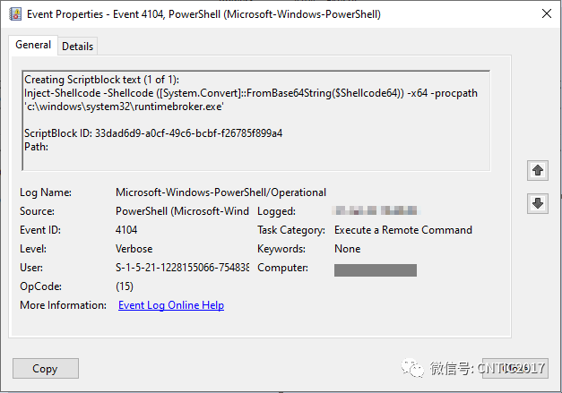 图11:显示 shellcode 注入 RuntimeBroker.exe 的事件日志然后加载base64编码的.net可执行程序,其中包含base64编码的PoshC2 PowerShell植入程序,整个攻击链最终允许攻击者以一种更隐蔽的方式重新建立后门,并作为一个已知的Microsoft进程运行。要建立持久性,攻击者将一个名为WinComp.bat的批处理程序放到磁盘上。首先,它搜索进程iexpress.exe,运行注入的shellcode。如果进程存在,则脚本终止。否则,它会使用一个混淆的命令启动PowerShell后门,并连接到一个由攻击者控制的C2服务器:![]()