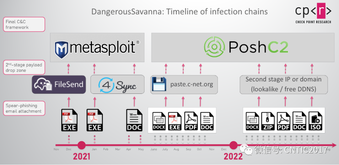 钓鱼邮件的附件类型以及随后的感染链,也在整个活动时间范围内发生了变化,从2020年伪装成pdf的自编写可执行加载程序,到2022年的各种文件类型。在微软决定默认阻止从互联网获得的宏之后,DangerousSavanna很快加入了恶意攻击的趋势,从“经典的”启用宏的文档转向尝试其他文件类型。![]()