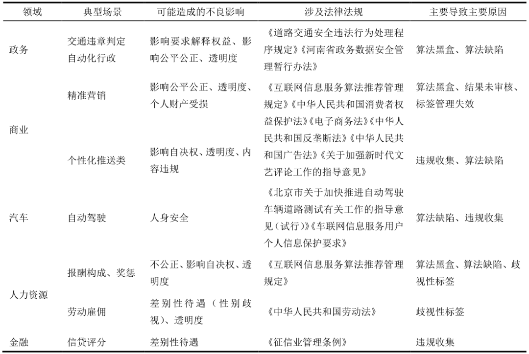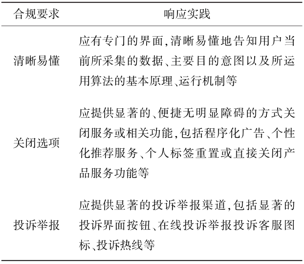 《个人信息保护法》是以宪法为基础,关乎人权,保护个人信息权益、尊严和自由,所以在个人信息不被泄露之外,还需要保障个人信息主体的其他个人信息权益得以被响应,包括一些基本权益的响应,如知情权、决定权、撤回权、访问权、可携带权等。同时,《个人信息保护法》中除敏感个人信息主体权益外,也提出了不同类型处理者需要满足的一些具体的要求,包括在重要互联网平台服务、用户数量巨大、业务类型复杂的个人信息处理者需要履行的相关义务。在自动化决策场景下,对个人信息安全管控上的要求没有什么不同,在个人信息权益上有突出的特点。自动化决策对人的数据化、计算过程的去人性化,造成了人类主体性危机;自动化决策以轻推与操纵的方式构建人的自主决策,使人丧失自由意志,引发了人的自治性困境[2]。在《个人信息保护法》中对自动化决策下的个人信息主体权益做了更进一步的要求[3],主要包括:公平公正的权益,保证决策的透明度和结果公平、公正,不得对个人在交易价格等交易条件上实行不合理的差别待遇;提供拒绝的选项,通过自动化决策方式向个人进行信息推送、商业营销,应当同时提供不针对其个人特征的选项,或者向个人提供便捷的拒绝方式;要求解释的权益,当自动化决策对个人权益有重大影响时,个人有权要求个人信息处理者予以说明,并有权拒绝个人信息处理者仅通过自动化决策的方式做出的决定。《互联网信息服务算法推荐管理规定》对于用算法推荐技术进行服务的组织提出了相关要求[9],包括算法模型的合法合规、健全用于识别违法和不良信息的特征库、加强用户信息的标签管理等,同时也明确了相应用户的相关权益。由于自动化决策的场景非常广泛,会与实际的业务和服务所处的行业有紧密的关联,各行业也陆续形成相关的法规赋予个人信息主体相关的权益,同时也给予老人、未成年人等人群特定的保护要求。由表2可见,在自动化决策的各个场景之下,导致个人信息权益受影响的原因包括:违规收集分析数据,数据的输入未经过授权收集,比如违规个人特征标签;算法黑盒,算法的原理不公开、不透明,无法向用户解释其运行机制;算法缺陷,算法自身存在不准确、不安全的问题;算法结果未审核;使用违规标签,主要是使用用户未授权标签,或者使用歧视性标签;未提供拒绝的方式。其中,由于个人科技认知的差异,透明化和进行解释成为最关键的难点。表2 自动化场景下个人信息合法权益影响与原因分析表![]()