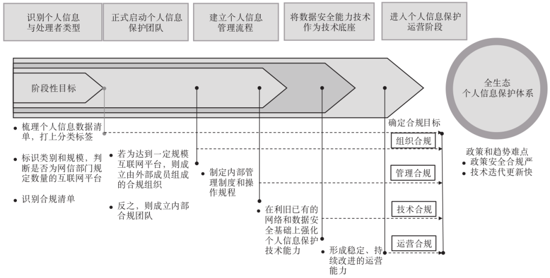 在欧盟的《通用数据保护条例》(General Data Protection Regulation,GDPR)中,自动化决策定义为完全自动的决策,即在没有人为参与下的以技术的方式做出决策,随着技术的进步和社会的发展,自动化决策需要从多个维度去解读[5]。根据其性质不同分为三大类:程序性和实质性自动决策,是指获取了程序性或实质性的决策结果;算法性和非算法性自动决策,是指通过算法或者未使用算法的方式做出的决策;基于规则和基于法律的决策,是指基于规则和基于法律做出的决策,如交通违规判别、考试录用系统等[6]。笔者认为自动化决策应当包含如下特征:采集一定数量的数据集;通过使用计算机程序、算法或规则进行的结果输出;通常会经过数据的收集、评估分析和决策三个环节,但不一定都经过评估或分析。《信息安全技术 个人信息安全影响评估指南》将个人信息安全影响认定为对个人信息合法权益的影响,包括个人权益影响和安全措施有效性两个维度[7]。欧盟数据保护委员会为应对GDPR中的相关条款给出的《法规2016/679关于数据保护影响评估(DPIA)和确定处理是否“可能导致高风险”的指南》中数据保护影响的因素,包括权益和自由面临的风险以及为应对风险所设置的措施两个方面[8]。因此,本文中关于对个人信息安全的影响同样关注两个方面:个人信息安全管控的有效性和个人信息主体权益的保护性。个人信息作为一种特殊的数据资产被存放在企业,需要满足不被泄露的基本安全要求。企业将已有的数据安全能力作为基础,以合规要求为抓手,做好个人信息保护,是当前的一种可行的解决方法。具体的路径包括:识别个人信息和处理者自身的类型,从而确认合规目标,启动个人信息保护团队,建立管理流,确定管控策略,通过对数据安全技术能力利旧,固化流程进入稳定的个人信息保护运营阶段,从而形成全流程、全生态的个人信息保护体系(见图1)。在数据安全技术能力的利用上需要特别注意的是在收集阶段,采用个人信息识别技术,打上个人信息种类标记,关注敏感个人信息安全;在存储阶段,应注意个人信息存储时间最小化的原则。![]()
