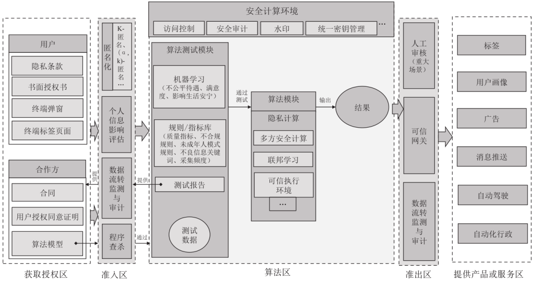 知情同意是处理个人信息使用的先决条件。在自动化场景下,获取授权同意的对象主要包括两大类:一类来自个人信息主体,通常因提供产品或服务而收集;另一类来自合作方,如受合作方委托处理或者直接向合作方提供产品或服务,甚至运算环境。当然,在《个人信息保护》中规定的无需取得同意的例外情形,如为应对突发公共卫生事件时,可以直接进入准入区。(1)当直接收集来自用户个人信息时,主要是通过容易触达的用户终端使用隐私条款、弹窗告知用户同意,并使用标签页,告知并会采集的相关标签;在隐私政策中,明确告知使用自动化决策或者进行用户画像分析的业务场景,对所使用的个人信息类型、目的和方式、算法推荐服务的基本原理、目的意图、运行机制等基本要素进行明示,并在具体的业务模块中使用弹窗、页面标签等形式向用户明确告知自动化决策机制的使用,并接收算法区的测试报告,以供需要时使用。(2)涉及合作方的情况,若合作方仅仅希望得到产品或者服务(如画像等),则需要签订满足合规要求的合同;若合作方提供相关的个人信息数据,希望借助当前的计算能力获取相关数据时,则需要提供所携带相关个人信息的个人主体授权同意的证明。值得注意的是,匿名化处理后进行自动化决策的,也同样需要注意自动化决策给个人主体带来的影响。例如,在利用用户画像所做的一系列决策,可能会对个人主体造成一定的影响。个人信息在商业应用场景下大多是通过匿名化的方式得到合法正当的支撑,当前匿名化技术主要包括K-匿名、(α, k)-匿名等,需确保匿名化的个人信息不可恢复。另外,也需通过管理手段,对当下的情景进行个人信息安全影响评估,发现当前存在的短板,采取一系列的控制措施,从而降低对个人信息安全的影响。同时,也需要使用数据流转监测与审计的技术手段保障采集的数据源安全。若合作方提供算法模型,则需要对相关的程序进行查杀,从小范围试算起步,待验证各方面符合要求方可进入计算环境。算法区包括数据安全的保护能力应是个人信息保护的底座,故而需要使用一系列的数据安全技术手段来保障在自动化决策中的个人信息不会泄露或者过程可追溯,主要包括访问控制、安全审计、水印等,同样也包括对日志进行记录,确保所有的人为干预都被记录下来。另外,使用统一的密钥管理模块,在隐私计算所使用的秘密传输、不经意传输等密码学技术基础上,支撑各类场景下的各类计算。在数据进入自动化程序时,需检验算法是否会对个人信息权益造成影响,主要通过算法测试模块实现。算法测试模块主要包括机器学习子模块、规则/指标库子模块、测试报告子模块。(1)机器学习子模块利用一定数量的测试数据集进入机器学习,检验相关标签的组合是否会产生不公平公正、影响到个人安宁以及客户满意度的结果。其中,除了需考虑自动化决策本身所造成的影响外,还需重点考虑在包含敏感个人信息时所造成的影响。(2)规则/指标库子模块包括了对不合法标签的发现,主要通过测试模块内置的合规标签库,发现违法违规、不良信息的关键词。例如,职业录用时,涉及性别标签,或者其他的带有侮辱性的标签(如暴力、色情等情况)。另外,也对质量、性能指标做测试,发现算法的缺陷;针对个人信息的采集频次做指标,保证最小频率地采集个人信息。(3)测试报告子模块,对算法的测试进行记录,形成测试报告,以通俗易懂、简洁明了的形式呈现算法的运行机制,决定算法结果的参数、算法结果的性质和类型、算法的质量,以供在自动化决策过程中,用户提出质疑或请求解释时,提供给授权区给予用户做出解释说明时使用,在此过程中也需注意企业自身的商业秘密不被泄露。在涉及与合作方合作形成数据共享和开发利用产品或服务时,可选择多方安全计算、联邦学习、可信执行环境等技术来实现涉及个人信息的数据可用而不可见,从而最大限度保障在数据开放流通的过程中个人信息安全不受影响。在分析结果对外提供时,应通过准出区,方可提供算法结果。需要注意的是在对于个人信息主体会造成重大影响的场景下,需要人工审核的接入,来降低对个人信息的影响,例如涉及到个人征信、身体健康、教育的情形时。同时,部署数据流转监控、安全网关等设备,保障数据在传输过程中的敏感数据传输被记录和监控,确保数据提供过程中的安全。在提供产品和服务的过程中,应当时刻关注当前所涉及到的法律法规和行业标准的监管要求,从而保障数据和产品的合规性。同时,也应当注意用户在使用服务过程中的相关诉求,如给用户设置关闭推送的功能、提供便捷的投诉和举报的途径等,具体参照表4示例。![]()