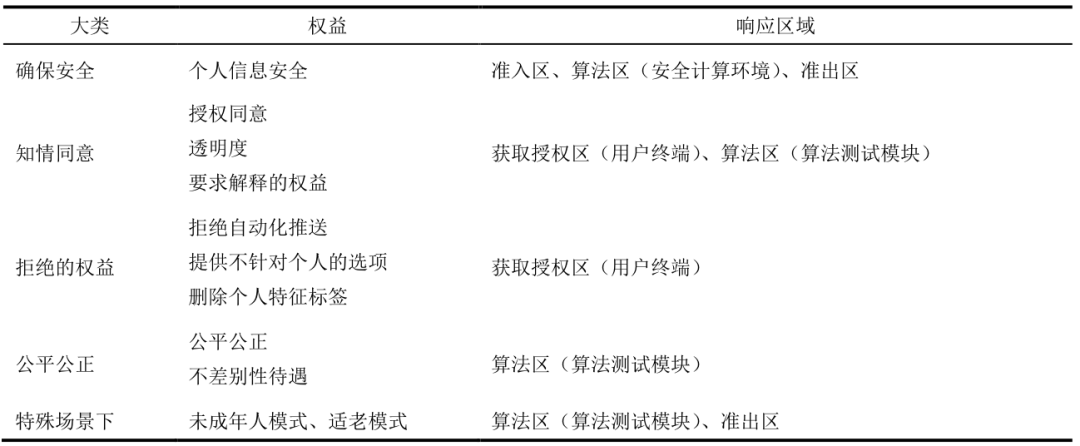 本文以健全自动化决策场景下个人信息安全管控为手段,保障个人信息主体合法权益为目的,搭建了降低自动化决策对个人信息安全影响的模型(见图2),主要包括获取授权区、准入区、算法区、准出区、提供产品或服务区,个人信息权益响应的对应关系参见表3。![]()