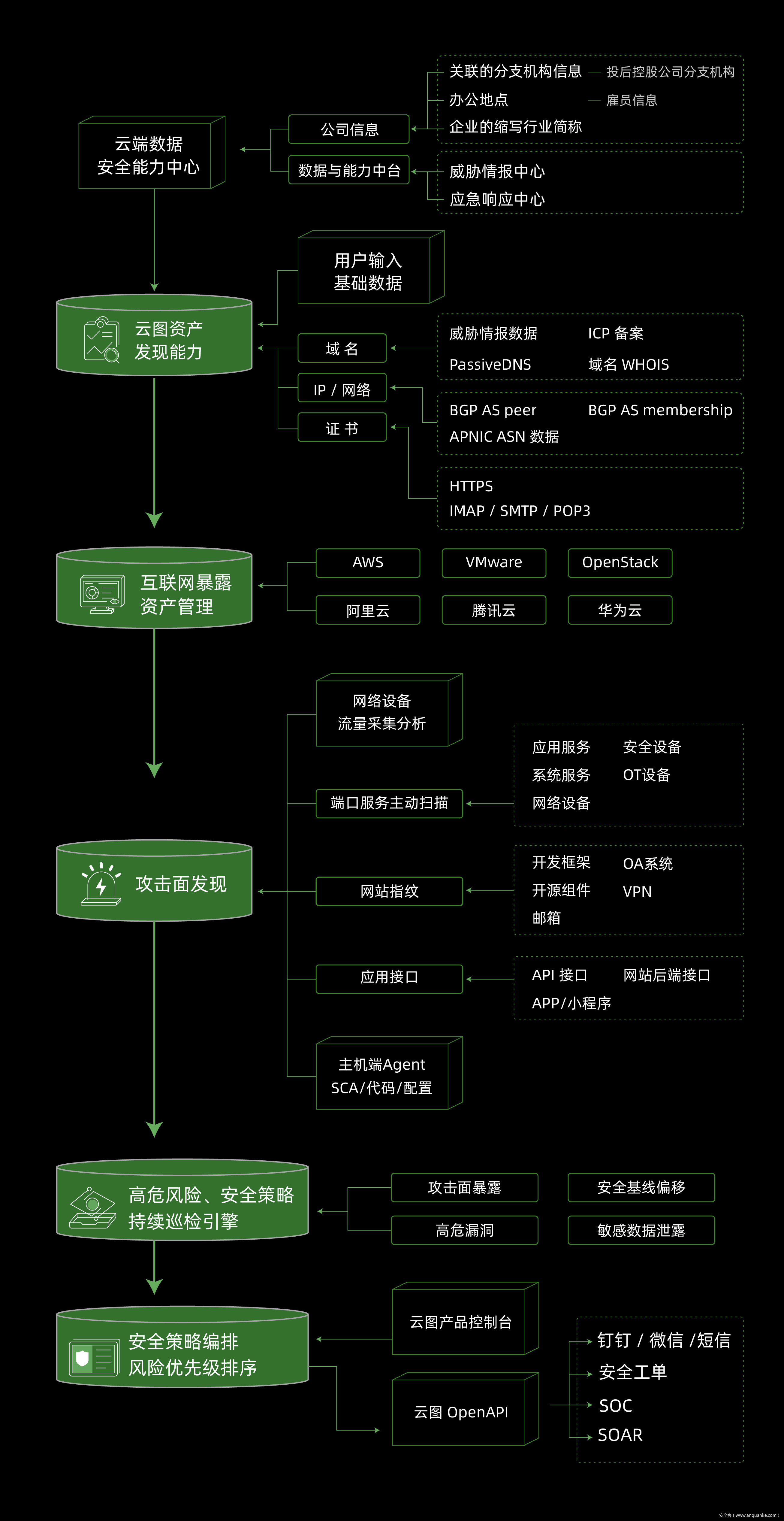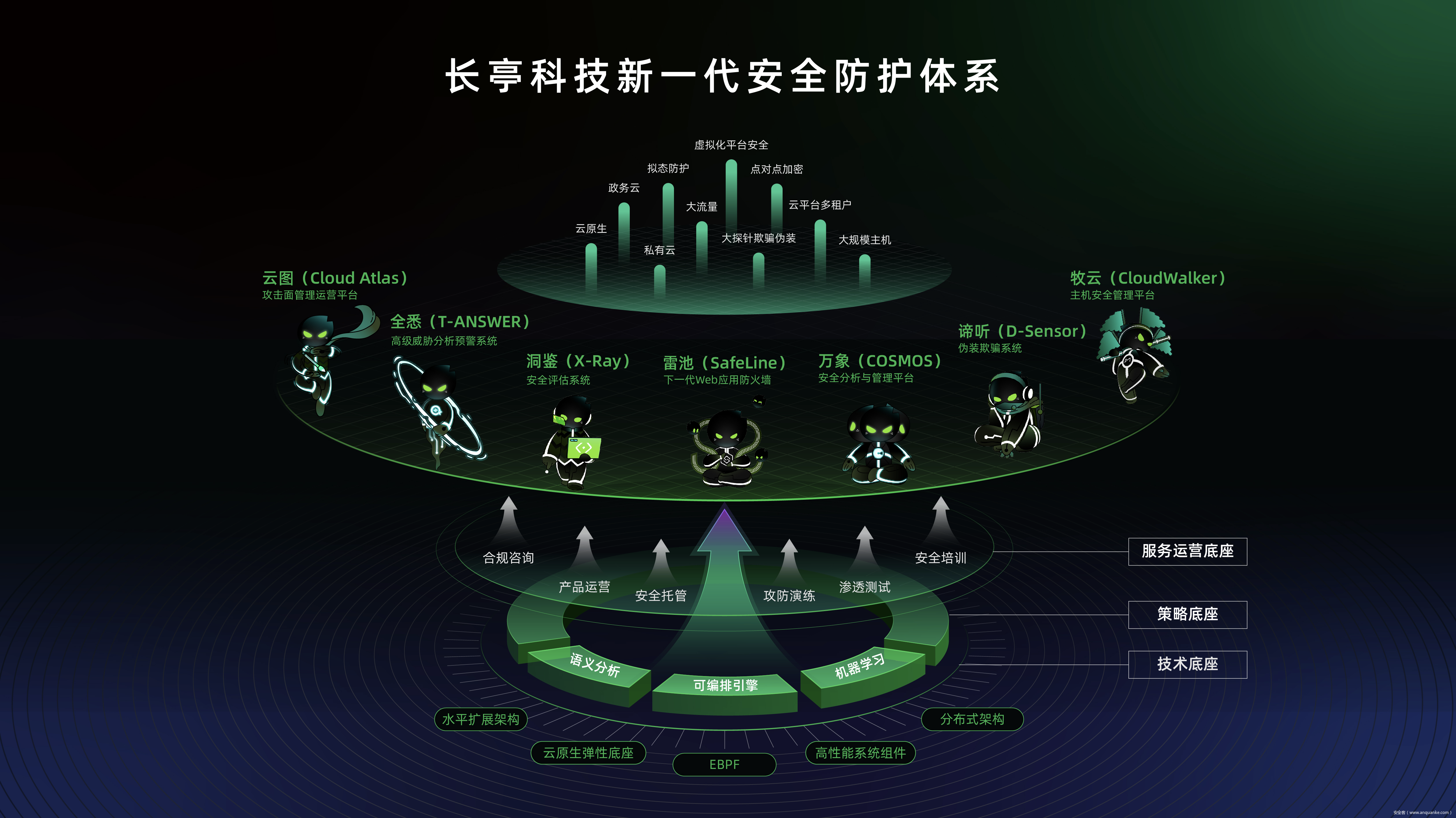 云图(Cloud Atlas)核心依托构建在云端强大的数据中台能力和长亭成熟的安全服务团队,提供给客户五大核心能力: