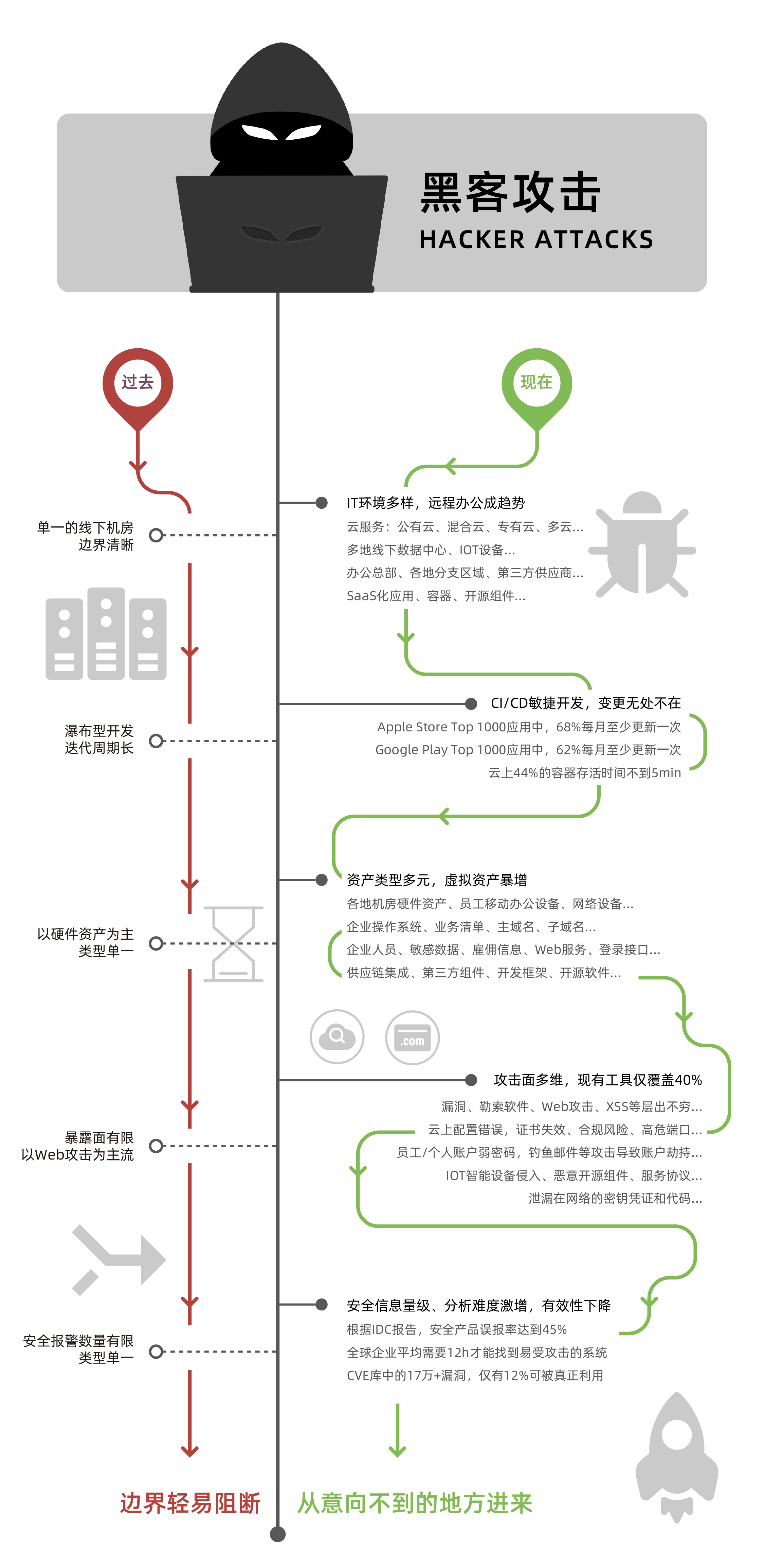企业在逐渐失去对资产的可见和掌控:复杂IT环境、多类虚拟资产、快速业务更迭…盘根错节、千丝万缕的关联性,只要与被攻击目标的网络或业务存在关联,就会成为攻击路径中的一环,攻击面快速放大。