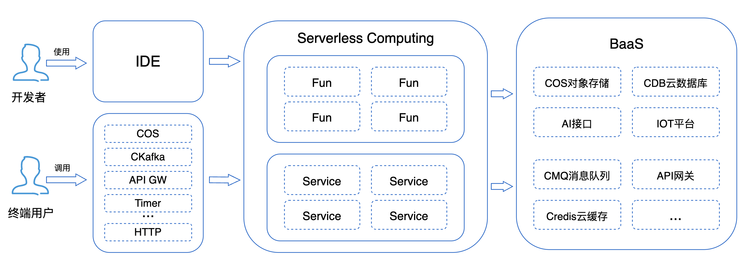 Serverless(又称为无服务器)架构是一种全新的云计算模式,它是在容器技术和当前服务模式基础之上发展起来的,它更多的是强调后端服务与函数服务相结合,使开发者无需关注后端服务具体实现,而更侧重关注自己业务逻辑代码的实现。