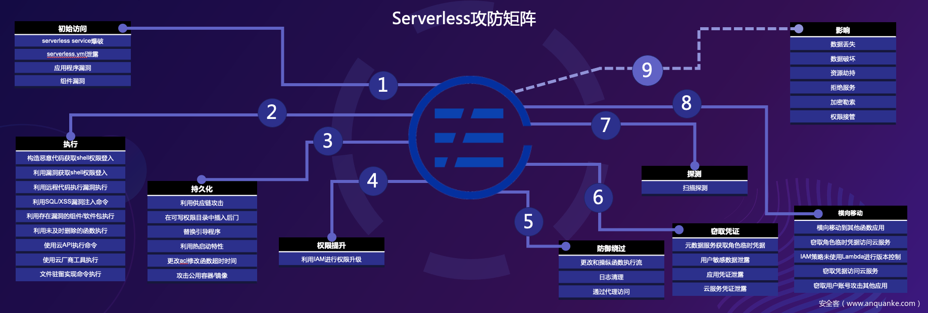 Serverless一般的攻击流程:攻击者通过应用程序漏洞或者组件漏洞实现初始访问权限,当获取到服务器权限后,攻击者会尝试查找并窃取用户凭据或服务凭据,然后利用可用凭证进一步横向攻击其他云服务。整个攻击过程包含但不限于以下攻击方式: