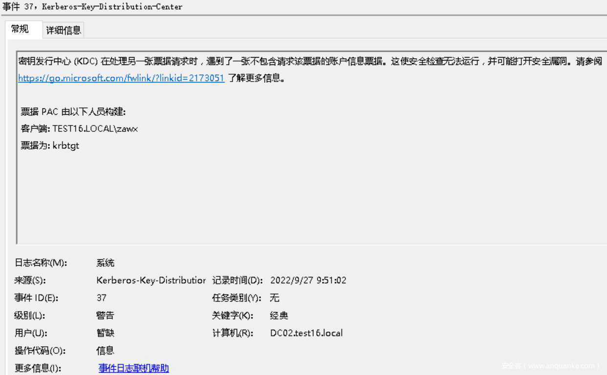 大部分情况下,攻击者不会去修改默认的用户SID,如果在制作黄金票据时对应的用户名不存在或者其SID不是500的话,域控上将会触发event 38日志,如果使用的工具没有更新PAC结构的话将会触发event 37日志,通过这两条日志就可以对黄金票据攻击进行检测。