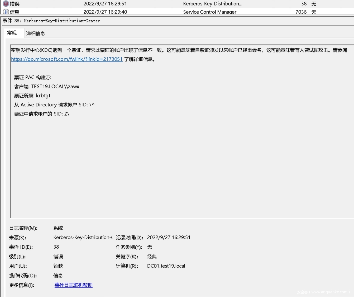 |38|错误|请求 TGT 或证据票证的帐户与生成服务票证的帐户不匹配|
