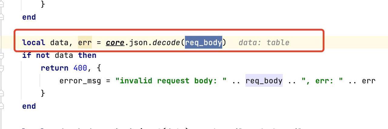 函数参数为data是我们传入的请求体经过json.decode()后的数据、类型为”table”。