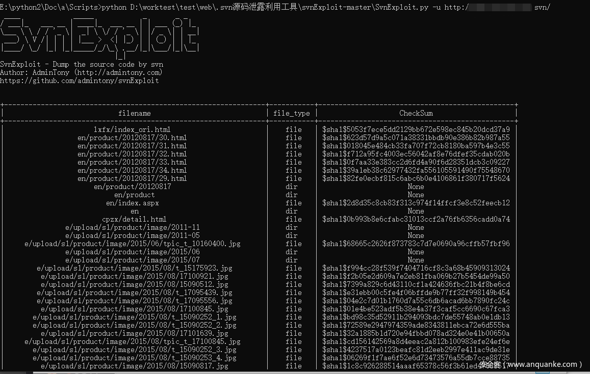 使用svnexploit进行测试,命令如下:python .\svnExploit.py -u [http://www.xxx.com/.svn/](http://www.xxx.com/.svn/)