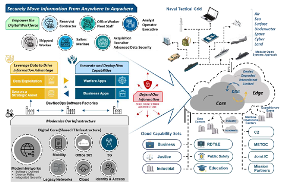 下图描绘了海军部信息环境的未来状态。图的左侧以海军部《信息优势愿景》为基础,从本文件提出的总目标为起点。《信息优势愿景》描述了三个战略目标:现代化、创新和防御,以及两个战略资产:数据和劳动力。