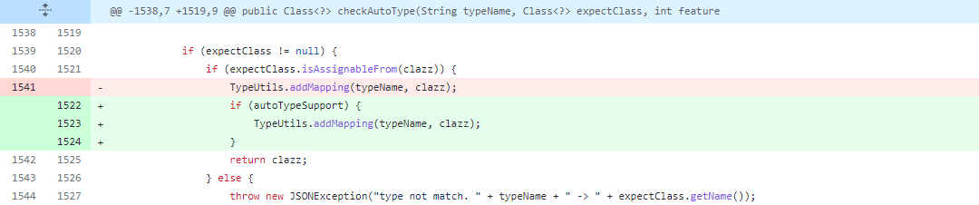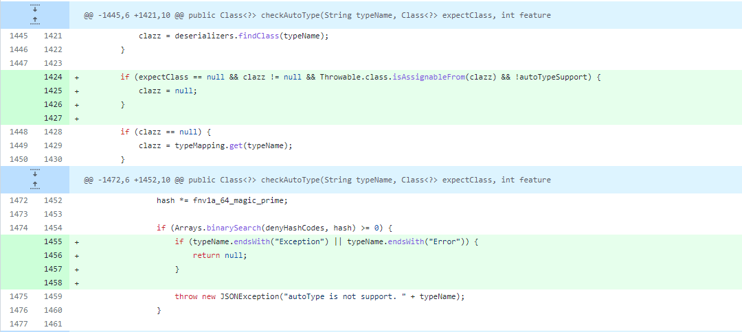 fastjson 1.2.80 漏洞利用是将异常类 Throwable 作为期望类,利用期望类机制将异常类 Throwable 的子类加入到缓存中。对比下修复补丁,可以看到在最新版fastjson 1.2.83中额外增加了对异常类的判断,并且在添加类到缓存前新增了对autoTypeSupport的判断,只有开启了autoTypeSupport才将类加入到缓存中。
