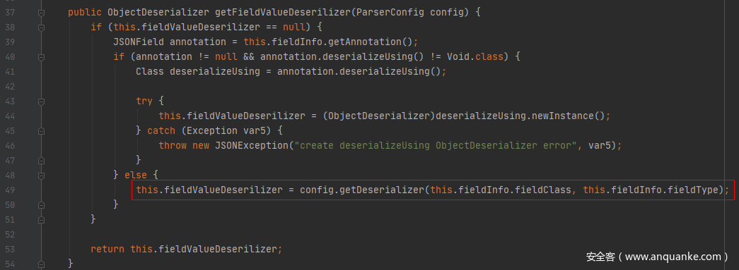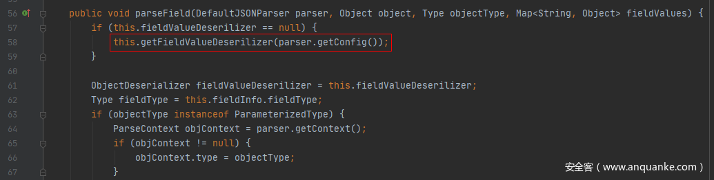 在 com.alibaba.fastjson.parser.deserializer.DefaultFieldDeserializer#parseField 方法中会调用 getFieldValueDeserilizer 方法,跟进该方法
