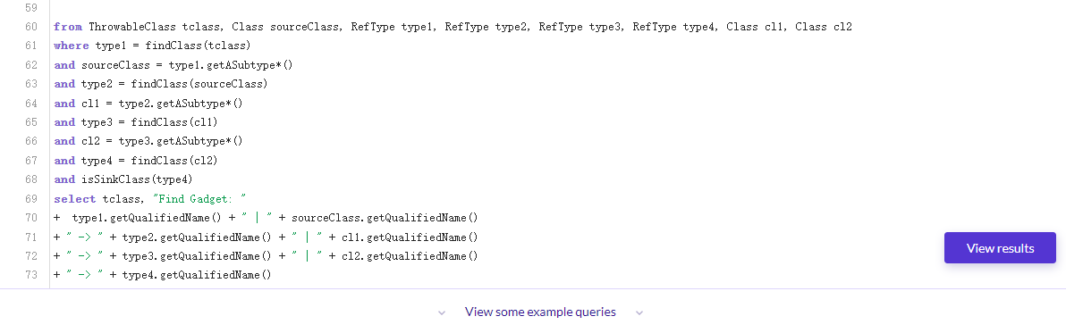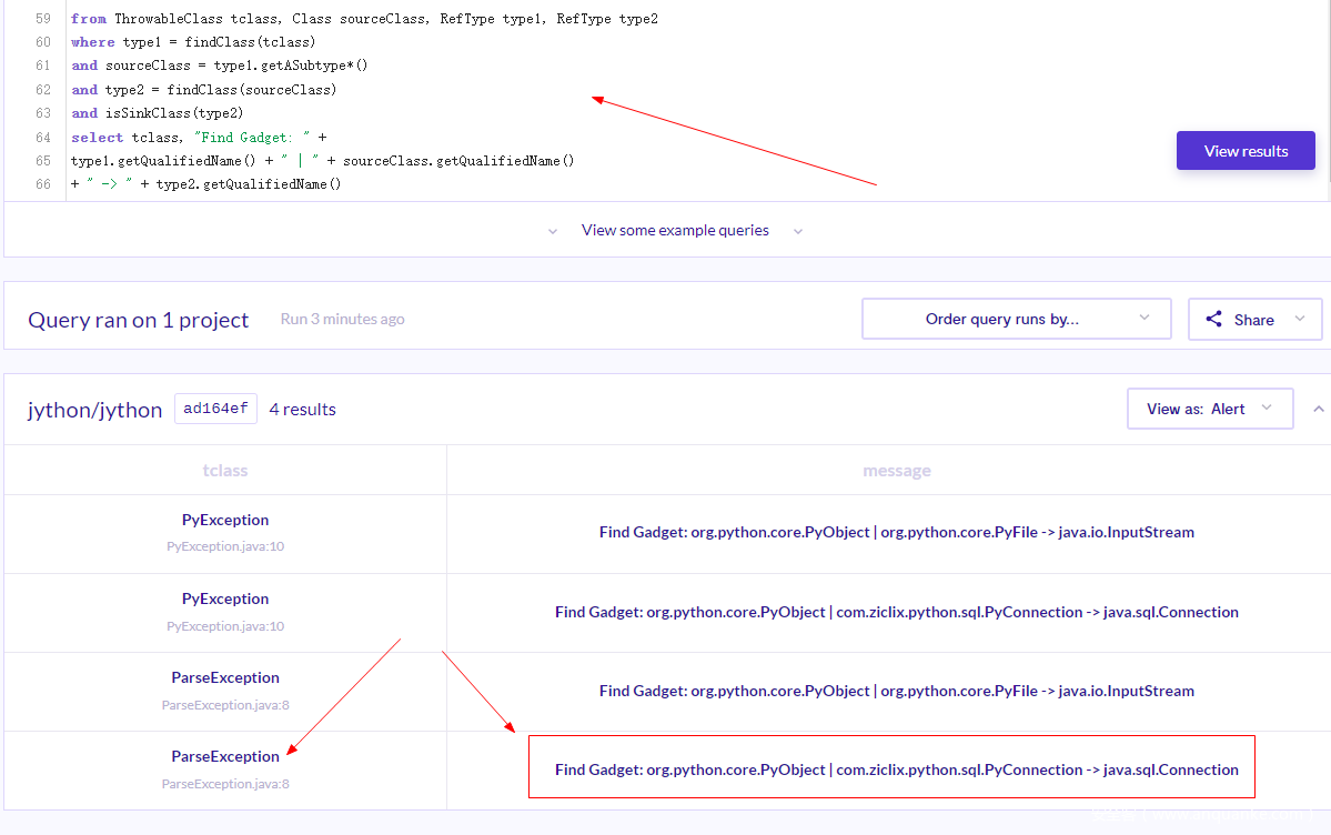 以查询Jython利用链为例,直接在LGTM平台上查询,这里首先调用我们封装好的谓词 findClass 获取异常类的字段,然后再根据字段对应的类或子类再次调用 findClass 获取类的字段,最后判断获取到的类字段对应的类是不是可利用的类