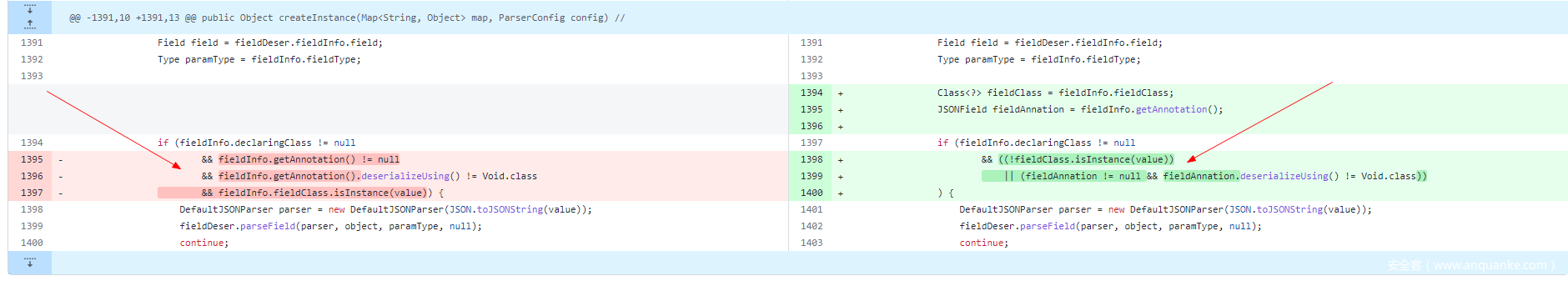 在fastjson 1.2.73版本中对 com.alibaba.fastjson.parser.deserializer.JavaBeanDeserializer#createInstance 方法的代码进行了修改,对比1.2.72版本可以看到,在1.2.73版本修改了判断逻辑,当value不是字段对应类的实例或类字段拥有注解就会调用字段反序列化器的 parseField 方法