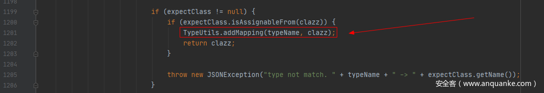 在旧版的 com.alibaba.fastjson.parser.ParserConfig#checkAutoType 方法中,如下代码判断expectClass(期望类)不为null,且类Class对象和期望类之间存在继承关系,就会调用 TypeUtils.addMapping(typeName, clazz);方法将类Class对象缓存