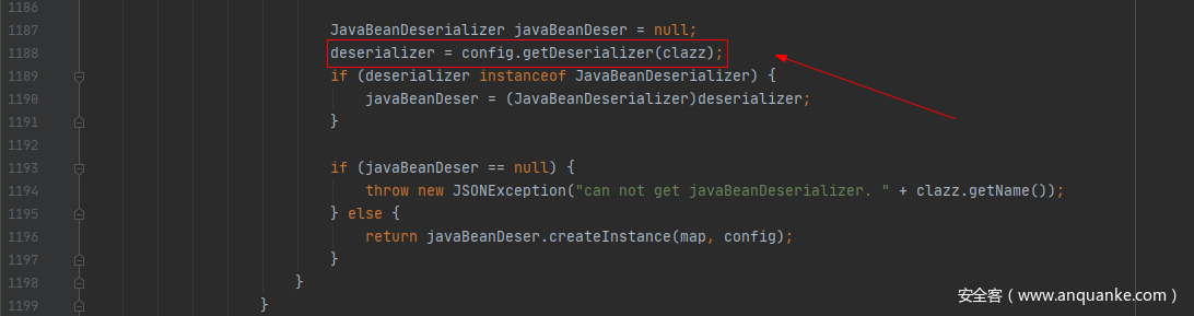调用 config.getDeserializer(clazz) 方法根据传入的类Class对象获取对应的反序列化器,而这里的clazz就是字段对应的类Class对象,而在 getDeserializer 方法的最后有调用 this.putDeserializer((Type)type, (ObjectDeserializer)deserializer); 方法,putDeserializer 方法能够将传入的类Class对象缓存起来,利用这个特性我们可以将类字段对应的类加入到缓存中,后续对类反序列化时,将直接从缓存中获取,从而绕过对autotype的检测。
