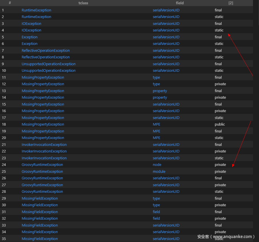 field.getAModifier() 用来获取字段的访问修饰符,可以编写如下测试查询语句,查询所有异常类的字段属性,以及字段的访问修饰符