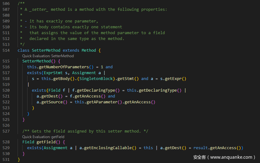 要获取类的setter方法的参数,可以直接使用codeql内置的 SetterMethod 类,这个类用来表示setter方法,该类定义在 Member.qll 文件中。