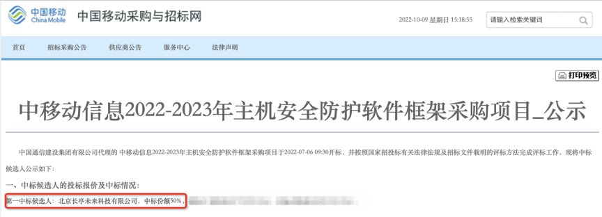 近期,中移动信息主机安全防护软件采购项目发布招标公示,长亭科技经过几十项严苛的招标测试,综合成绩排名第一,以50%的份额成为第一中标候选人。