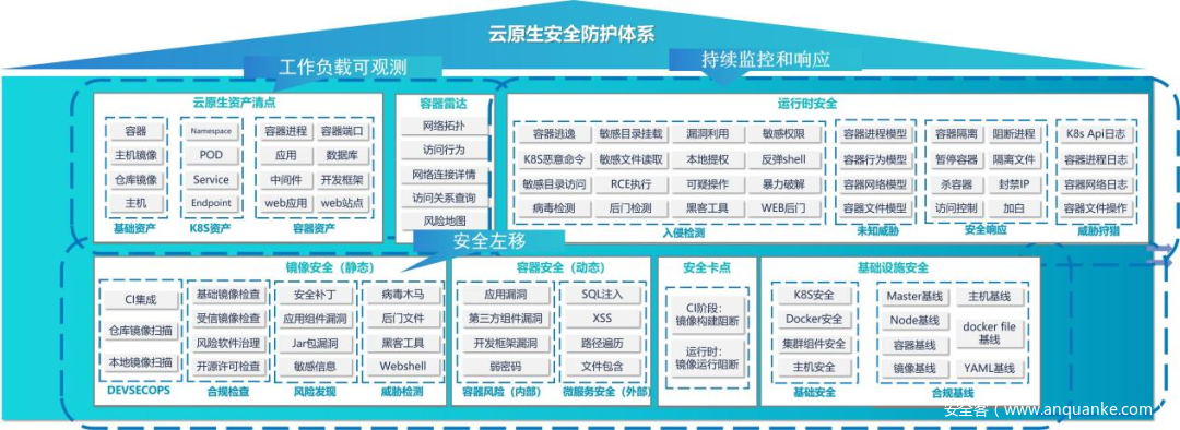 该方案可以保护所有涉及容器安全的对象,包括容器资产、进程端口资产、Kubernetes资产、应用资产等。在每个资产对象的保护方案中,考虑资产清点、加固、检测、响应、预测的安全框架,形成安全运行的闭环。