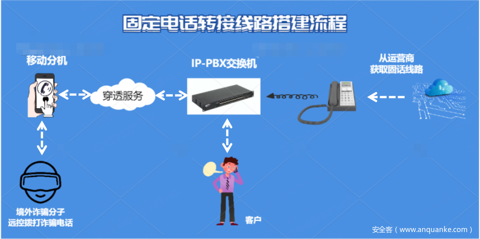 使用固话进行诈骗背后的跑通逻辑有两种:搭建固定电话线路转接给诈骗人员、云语音企业固话(云呼叫中心)。