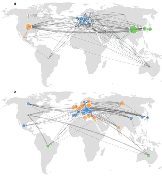 图2 41国数字货物贸易(a)和服务贸易(b)出口网络