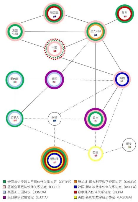 上述一系列数字贸易协议的签署倡导各参与成员在数字经济领域积极寻求合作,实现贸易畅通与政策互通。由大国竞争与合作而形成的数字贸易关系网正促使国际数字治理群落的生成,并推动群落内部成员凝聚规则共识。