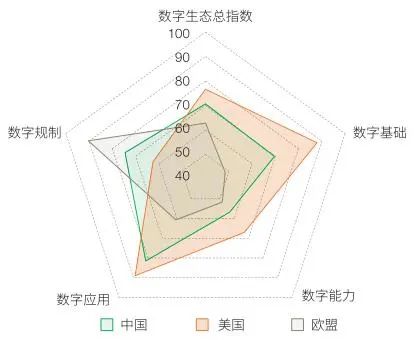 图3 中美欧数字生态总指数与四维度雷达图