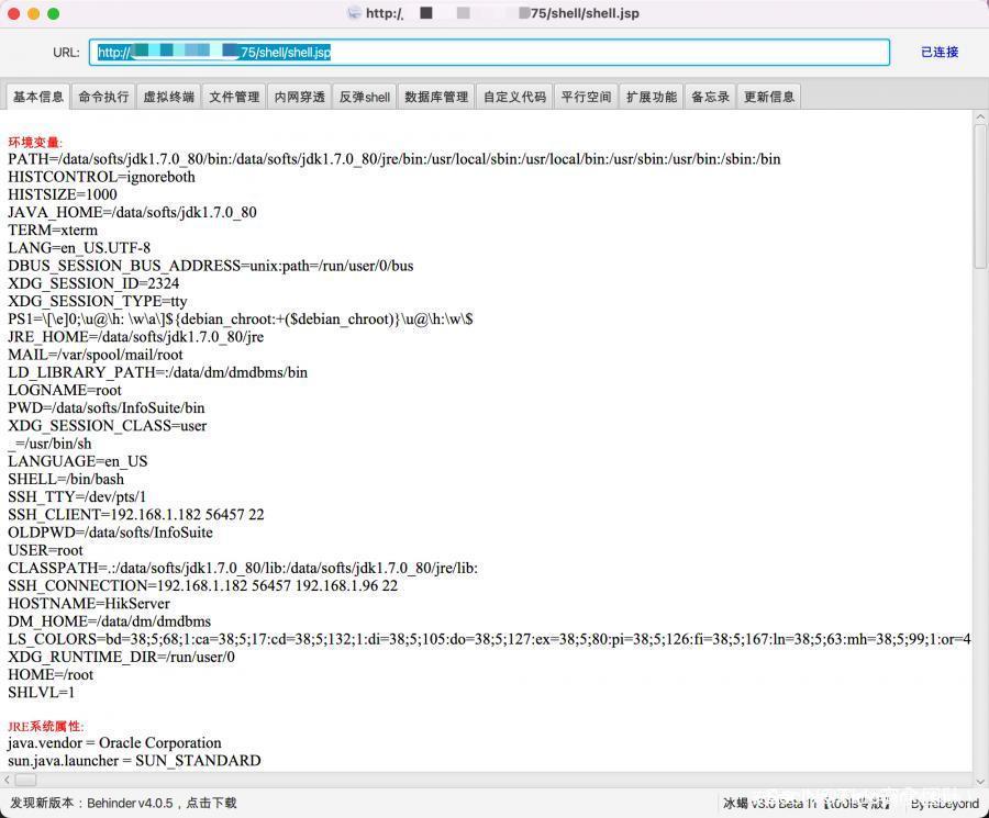 登录后台后我对系统内的配置开始进行信息收集试图通过查找相关配置文件进一步获取一些敏感信息。由于当时时间比较紧任务重,当时手里还有四五套系统需要测试就没跟仔细的研究这个中间件,粗略的翻了翻功能配置等信息就关掉了。在当时的项目中是政务网,测试的系统有十来套当发现这个中间件的以后我又对其他几套系统的8060端口进行访问,当然不用问剩下的系统都存在相同的问题都开放了中间件后台且默认口令。由于当时的项目是政务网,时后没有了环境也就没在意没在对该中间件研究。 6月份xx市hw,我们队伍的目标中有几个为政府单位。在我对目标进行信息收集打点的过程中我再一次遇到了某创中间件。这时候我意识到某创中间件绝非小众国产中间件,某创中间件应该是国产化推动下政务部门使用的一款中间件。 然后我通过默认口令尝试,非常幸运轻而易举的登录到了后台,这是一种胜是初恋久别重逢的感觉。这次的hw目的明确,打点拿到shell。于是对登录系统后仔细的研究了一番,发先系统部署功能与tomcat相识,可通过war包部署jsp站点,直接上马打包成war进行部署,冰蝎连接成功。 然后通过信息收集又收集到了多个相关资产均使用某创中间件且为默认口令,这一下子不就站起来了吗。# 详细打点过程步骤