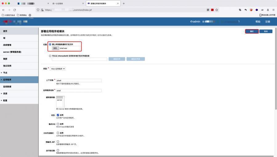 先将冰蝎jsp马在本地打包成war包,打包命令jar -cvf shell.war shell.jsp,然后在如下图中位置上传war包并进行部署