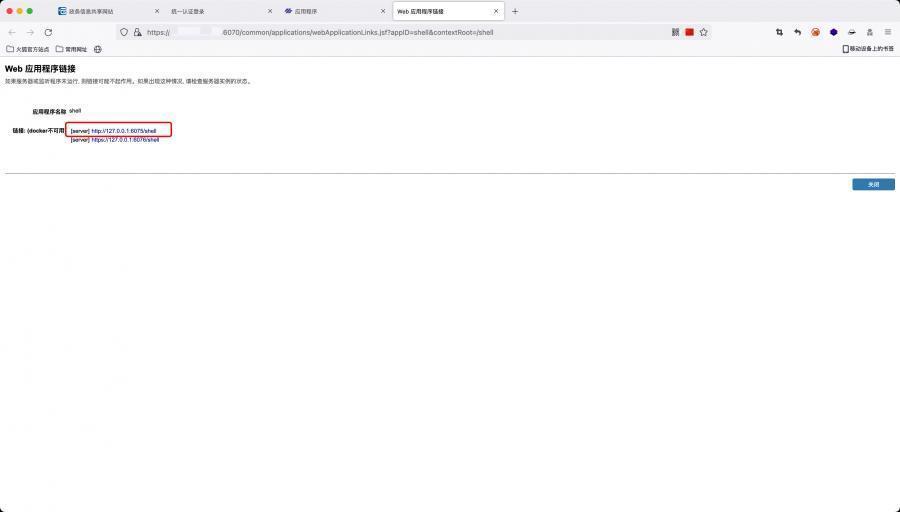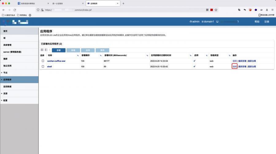 点击访问后系统跳转到下图页面,页面中给出了一个内网地址,通过改地址我们是无法访问shell的,在下图的地址中我们获取到了路径和端口,使用站点地址的域名或ip在部署后下图页面提示的端口路径下访问shell.jsp即为冰蝎的shell地址路径。