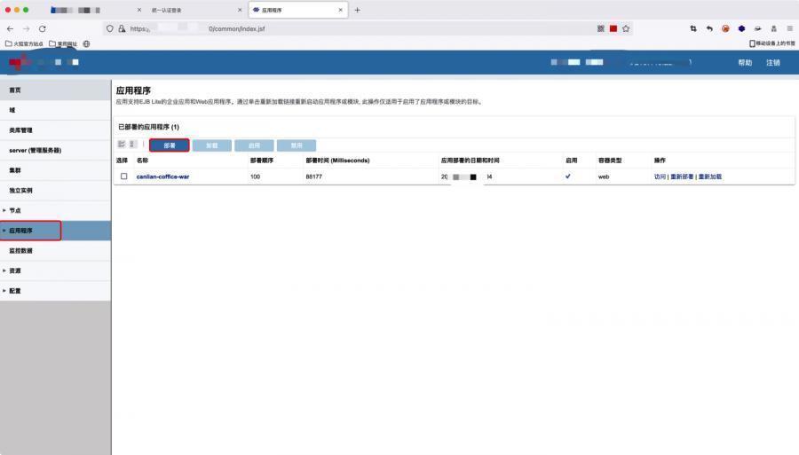 登录系统后在菜单栏点击应用程序进入应用程序功能找到部署,如下图所示。