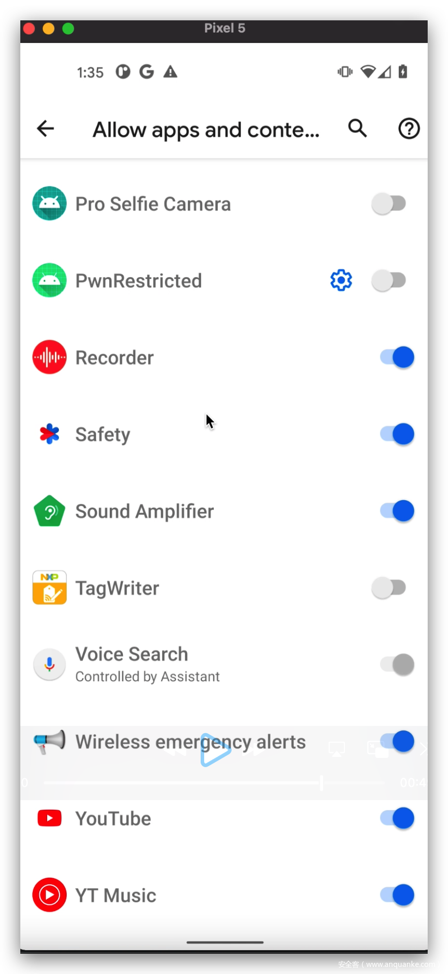 之后在多用户的设置界面就可以看到受限用户,而AppRestrictionsFragment就是用来控制该用户能使用哪些APP的。除了设置APP启用与否,还能对APP进行单独的设置(注意PwnRestricted旁边的齿轮):
