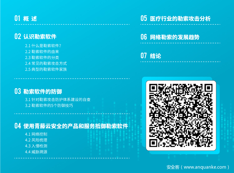 直播过程中,听众还能免费领取青藤云安全编写的《勒索软件的认识与防御指南》,这本指南从勒索软件的定义、来源、分类、攻击方式和典型家族等角度详细介绍了勒索软件的前世今生,并结合具体的安全产品和服务,给出了详细的解决方案,为企业组织提出了普适化的勒索攻击防护建议。具体目录如下: