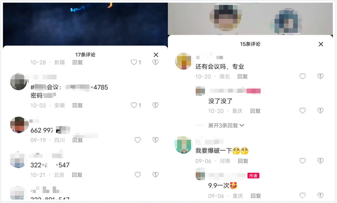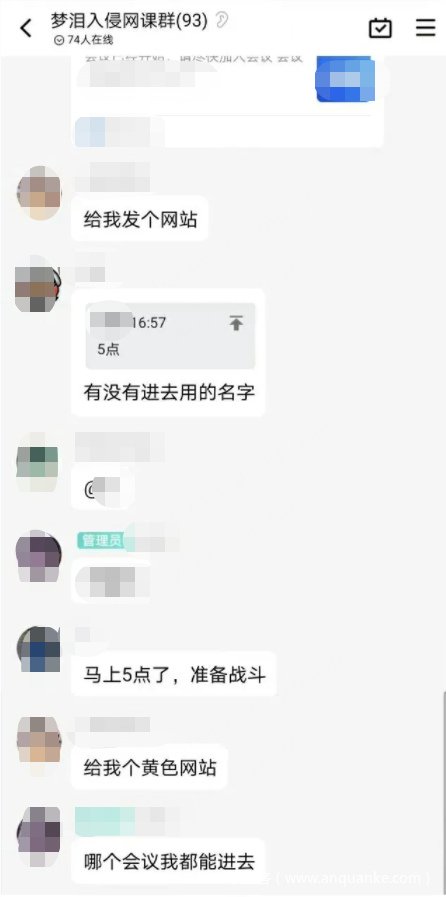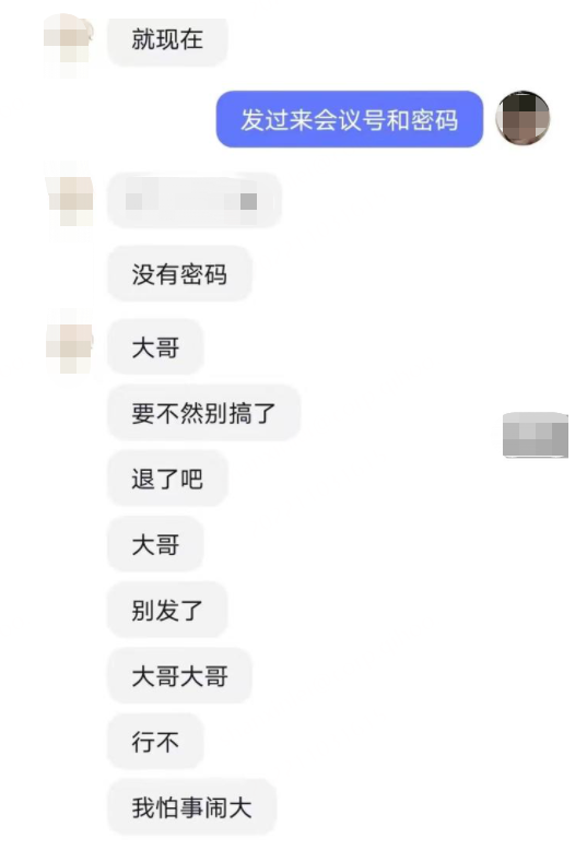 也可以看到有人发送会议号和密码,询价或请求“爆破”,而这些最大可能就是“内部人”(大概率是学生)。