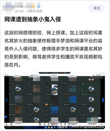 为这场悲剧感到心痛的同时,一种新型的网暴手段出现了,这种网课入侵的行为被称作“网课爆破”。
