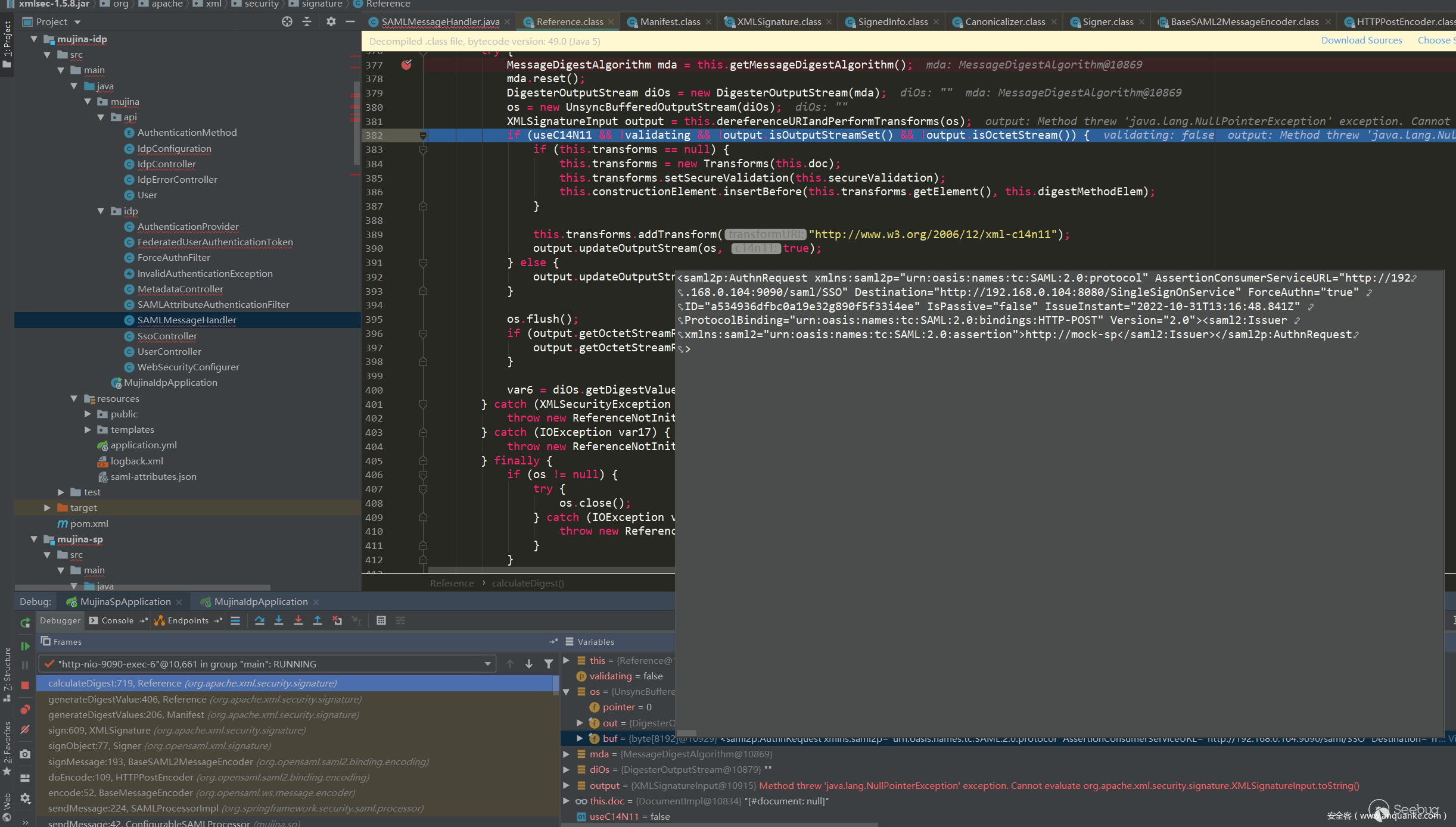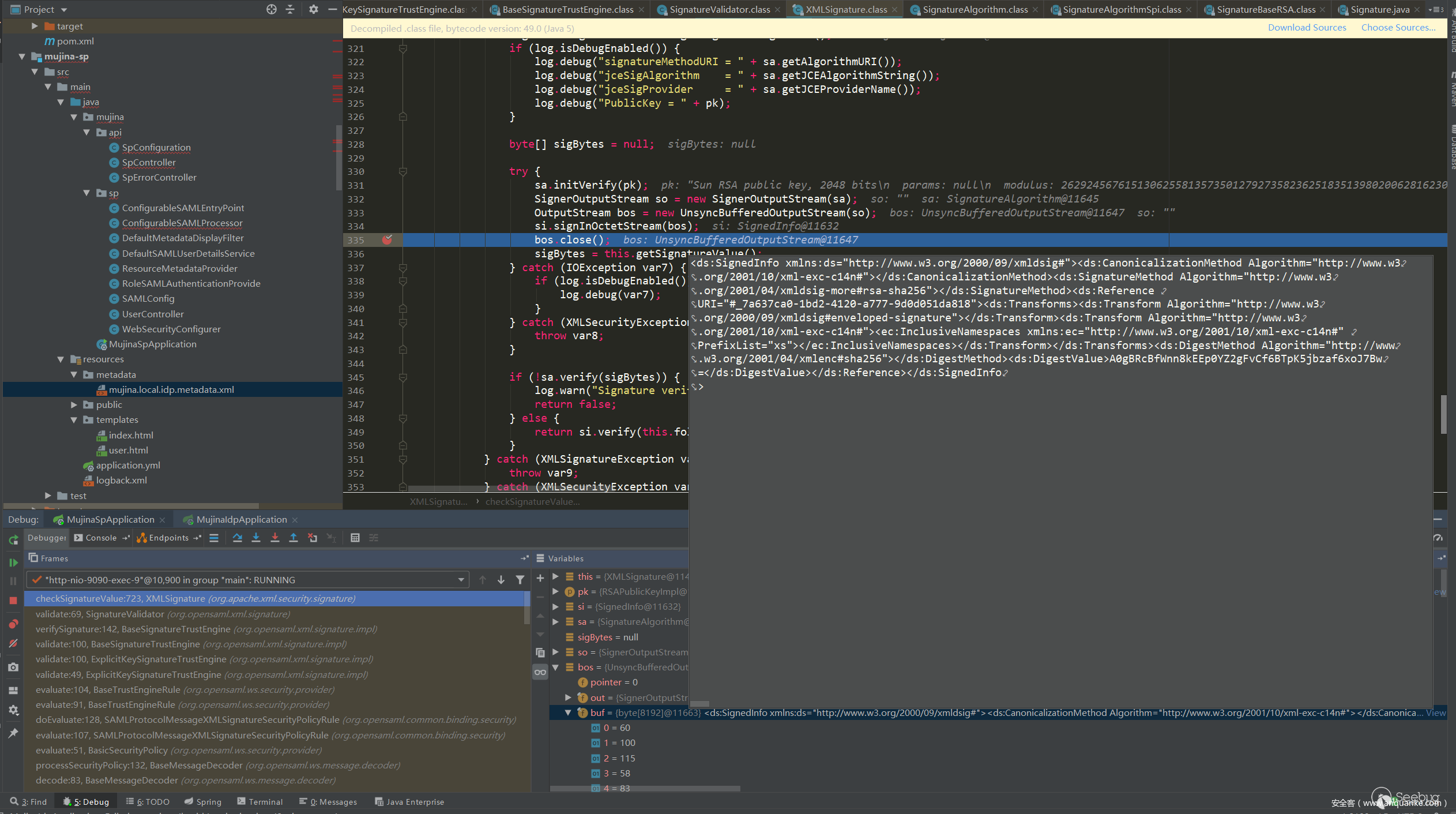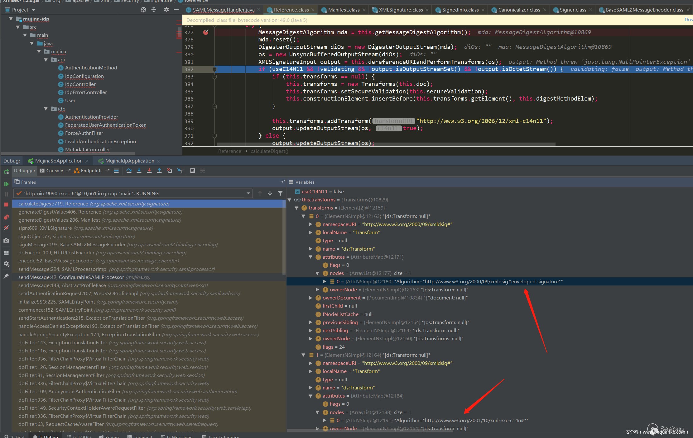 由于用的是比较新版的OpenSAML进行调试,在调试过程中可以发现一些修复痕迹,例如对XSW、ds:Object元素攻击的修复等。之前看到SAML或者SAML的漏洞报告就头大,因为里面涉及到了签名和摘要,而且还是对XML签名和摘要,是像字符串那样摘要和签名吗,不是的话又是如何签名XML,如何摘要XML,如何校验XML,我要攻击怎么篡改伪造,需要改哪些数据,怎么重新计算签名和摘要等,现在调试了一遍算是很清晰了。