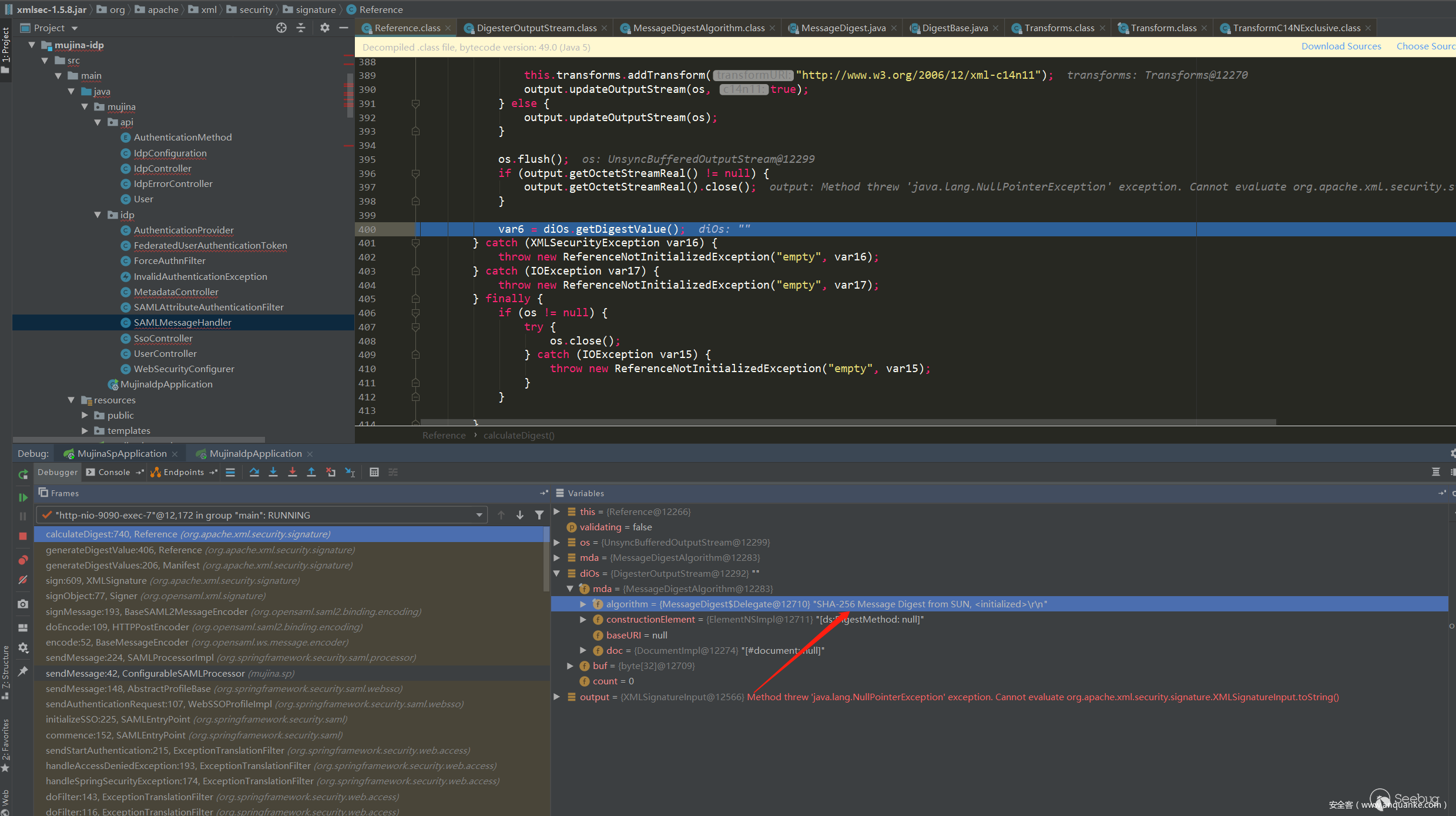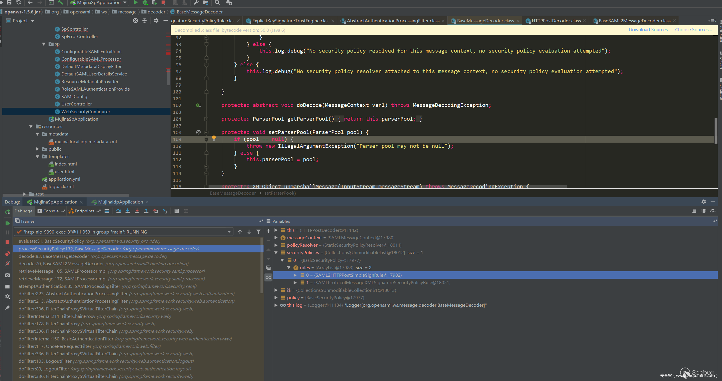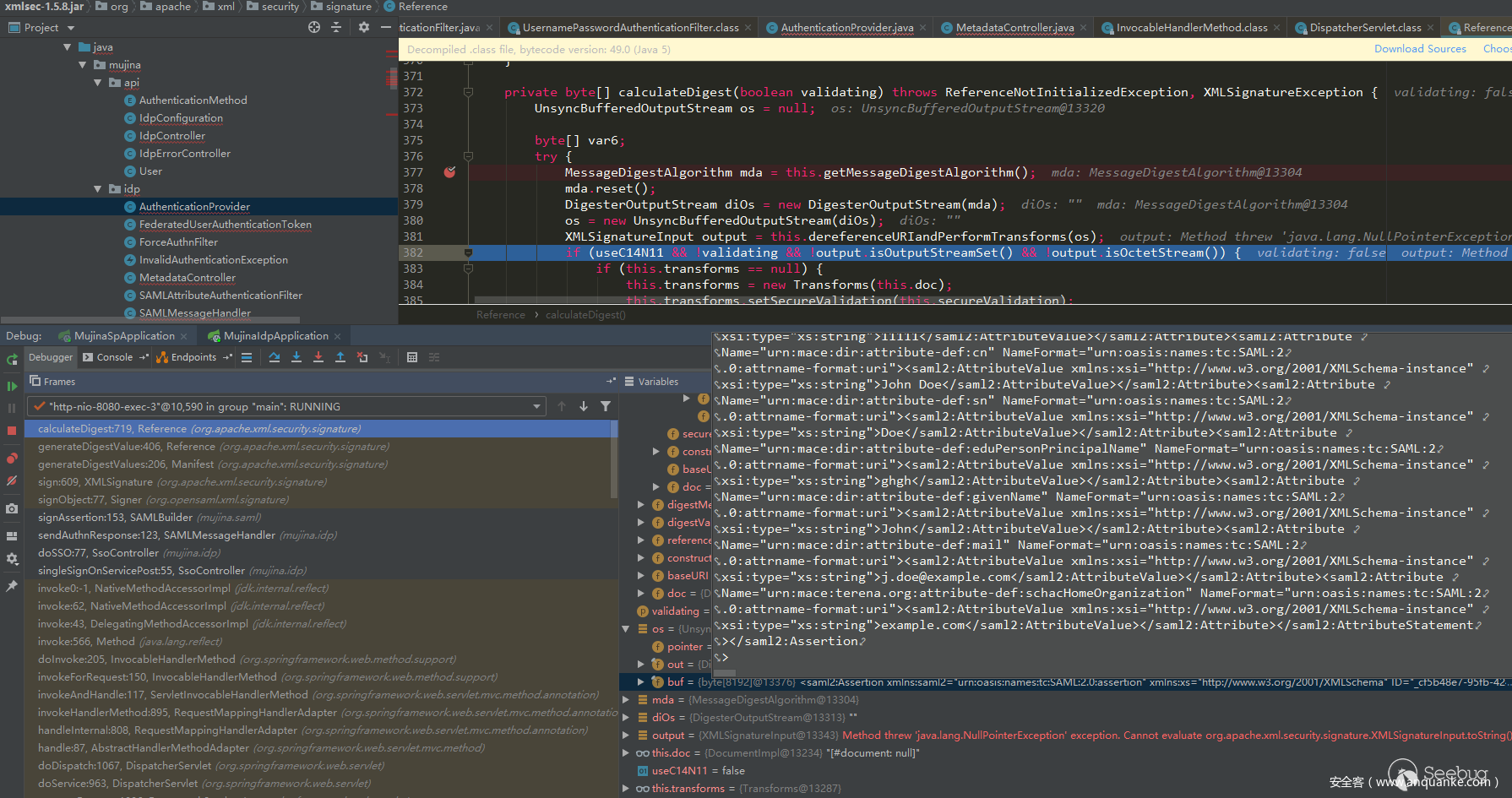 由于用的是比较新版的OpenSAML进行调试,在调试过程中可以发现一些修复痕迹,例如对XSW、ds:Object元素攻击的修复等。之前看到SAML或者SAML的漏洞报告就头大,因为里面涉及到了签名和摘要,而且还是对XML签名和摘要,是像字符串那样摘要和签名吗,不是的话又是如何签名XML,如何摘要XML,如何校验XML,我要攻击怎么篡改伪造,需要改哪些数据,怎么重新计算签名和摘要等,现在调试了一遍算是很清晰了。