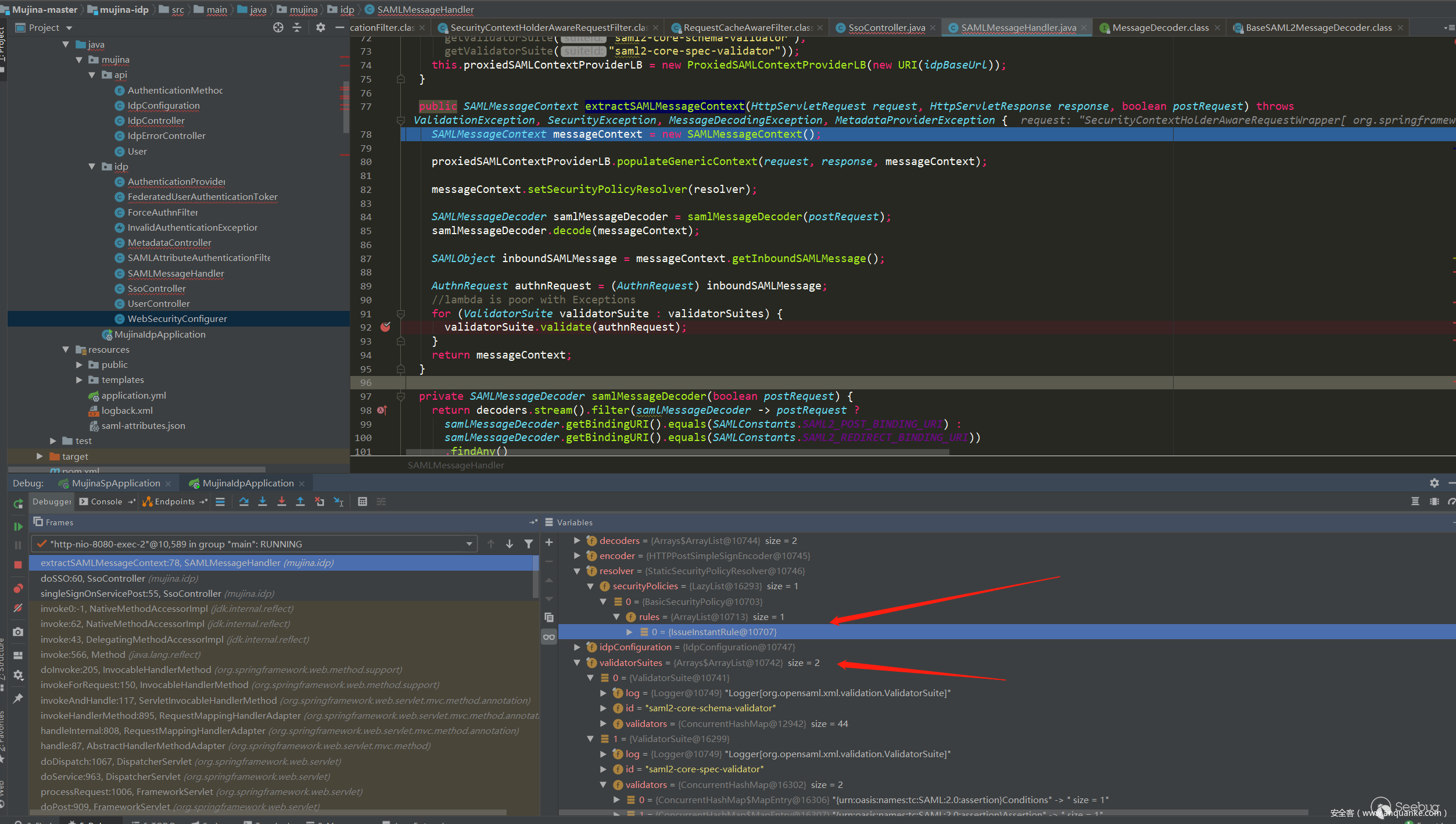 对AuthnRequest校验的安全策略只检测IssueInstant是否过期,没有其他策略。然后还有validatorSuites检测,可以看到有两种类型的validator,每个下面有多个标签对应的具体validator。不过测试发现这里IDP没有对AuthnRequest进行证书校验、签名校验、摘要校验的操作。
