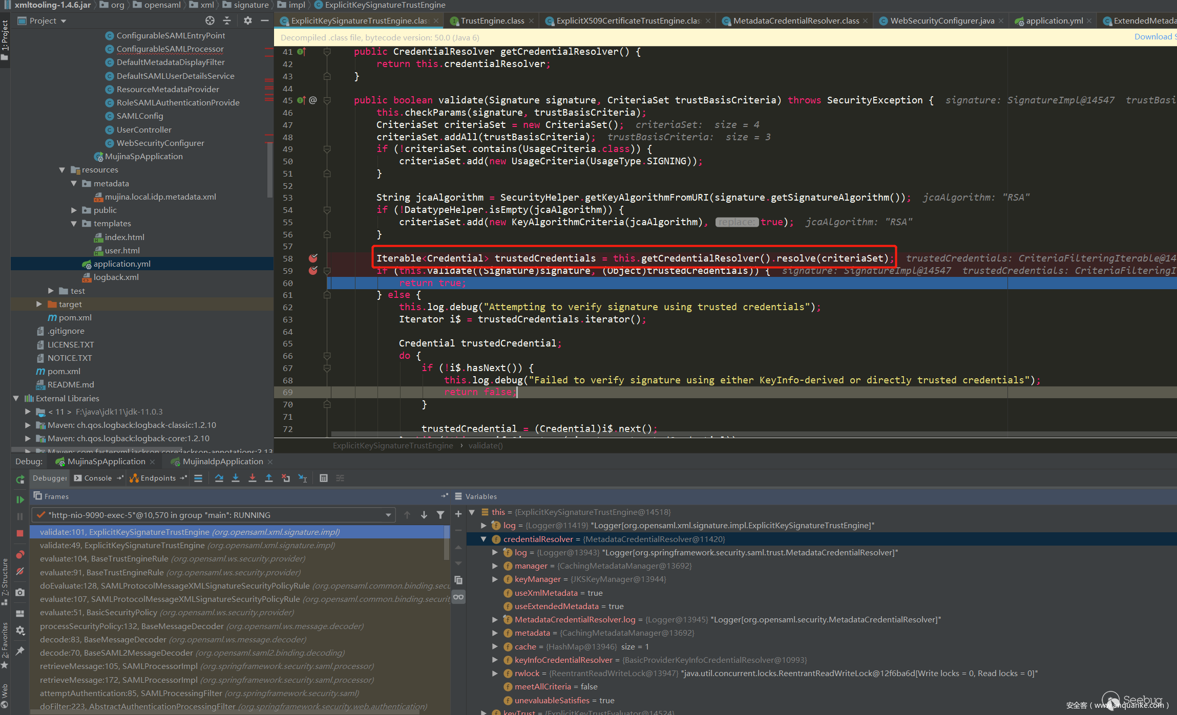 SAMLProtocolMessageXMLSignatureSecurityPolicyRule是校验Saml Response中的签名,首先会从本地提取IDP的证书(在classpath:metadata/mujina.local.idp.metadata.xml中有配置),这里并没有从传过来的Response中提取证书,而是用配置好的信任的证书: