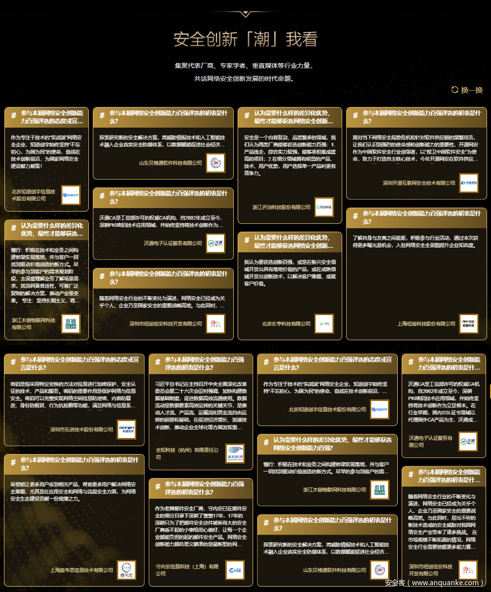 每年创新百强都会汇集大量的网络安全厂商、专家学者、技术从业者、投资客户等创新力量,引发全行业的广泛讨论。经历了两届的资源整合积累与评选品牌沉淀,第三届创新百强为能够进一步促进各方力量的思想交融,重磅上线“安全创新「潮」我看”栏目。每一位创新百强的参与者都可在此提出关于安全创新的任何问题,并针对喜欢的问题表达自己的独有观点。