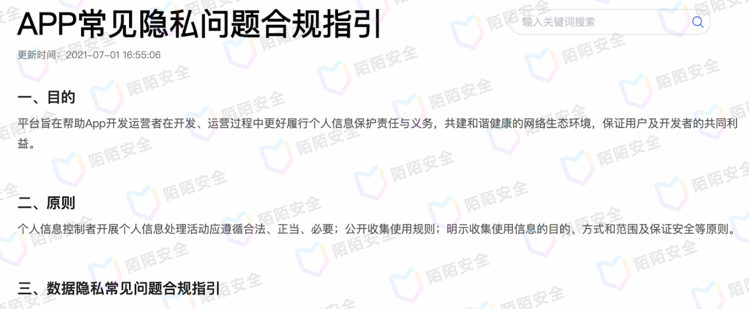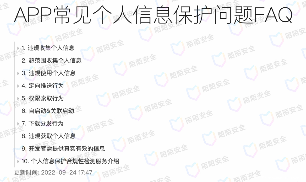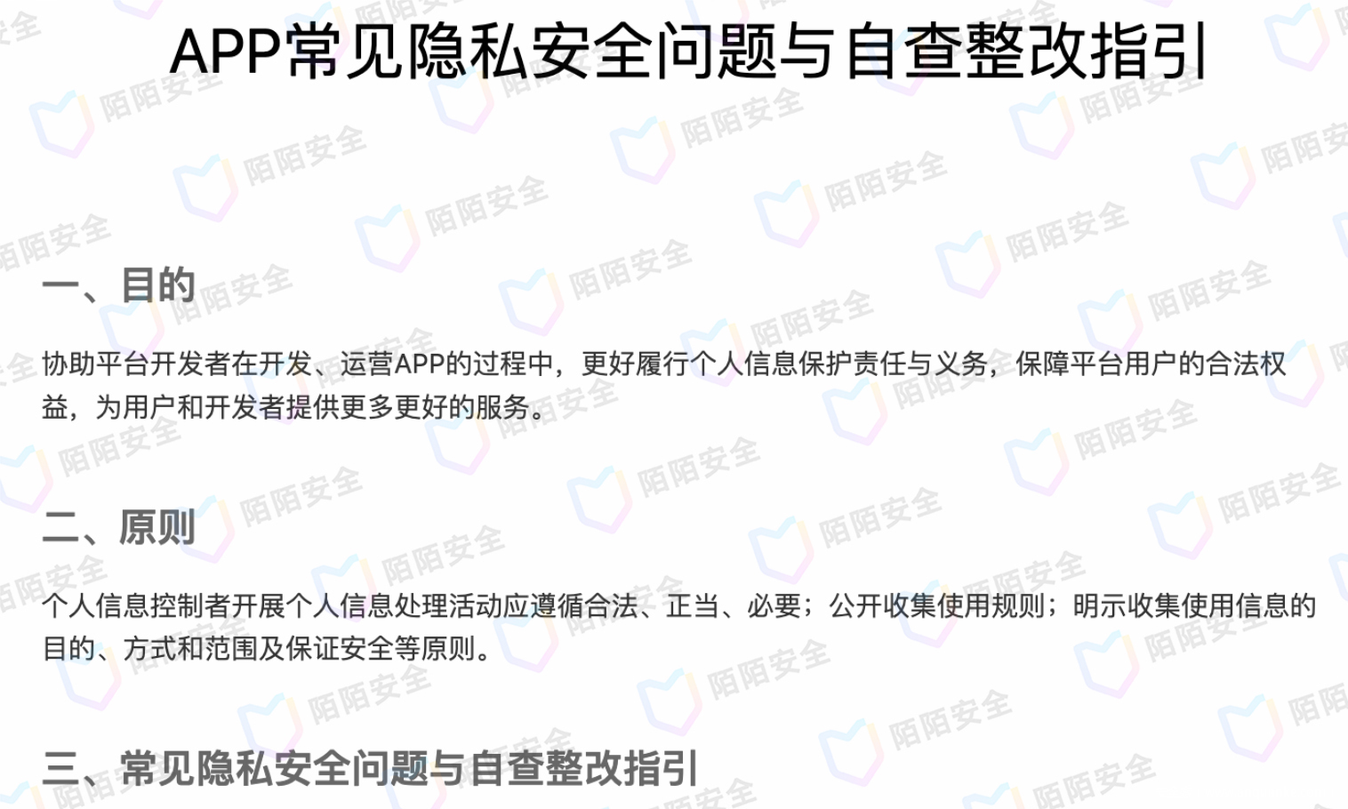 首先,需要大家了解,各大安卓应用商店针对隐私合规要求均发布了APP常见个人信息保护问题指引,指引基于个保法、网安法、工信部337号文、164号文等法律法规标准,明确规定了违规获取、收集、使用个人信息、超范围收集个人信息、定向推送、权限索取、自启动&关联启动、下载分发、开发者身份等方面的要求。