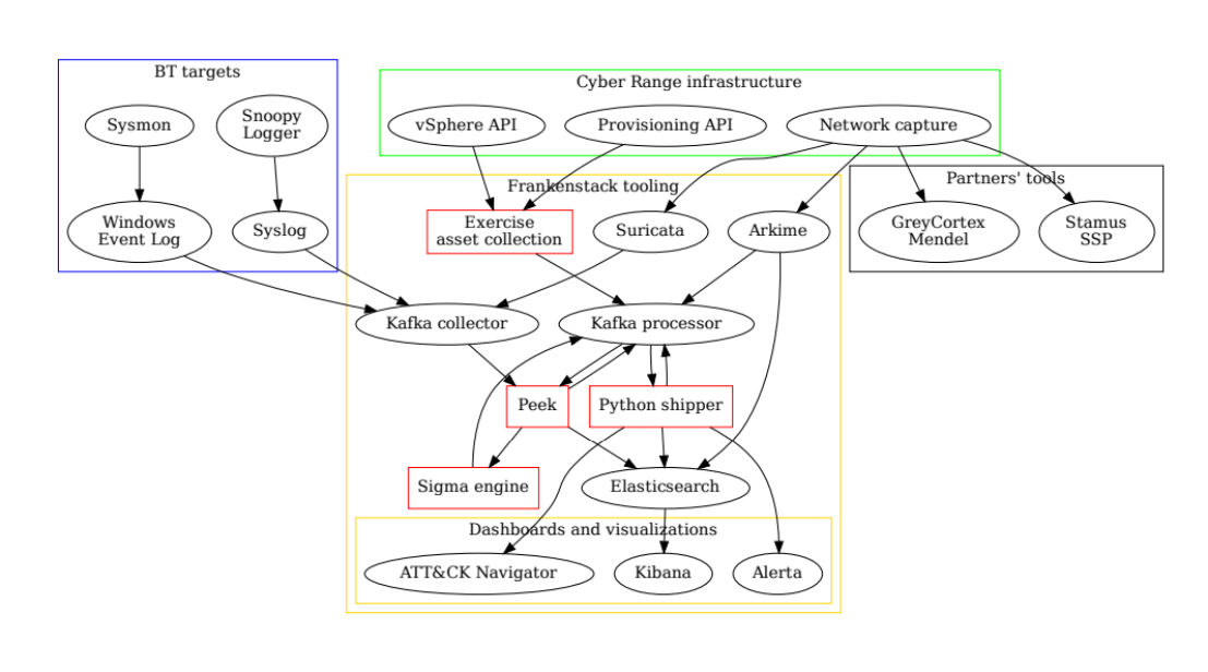 十字剑演习是在一个叫Frankenstack的平台开展的,如图5所示,该演习由几部分构成,不同部分标记不同的颜色并代表不同的团队。因为是红队使用演习平台,所以没有红队的内容。绿色代表靶场的核心内容,由绿队进行维护,通过各种API和流量抓包把各种数据输出,主要使用的是VMware NSX的数据中心的SDN方案。蓝色代表对攻击者的监控,也是蓝队的主要职责,通过各种日志和事件采集对事件进行汇总收集。黄色部分内容最多,包括了演习的监控和态势感知,是黄队的职责。可以看到使用了不同的消息队列,比如Kafka进行收集处理,同时有一些 Suricata 和 Arkime 的流量分析引擎,红色框的内容是论文中体现的改进的内容,包括资产信息的收集、Sigma引擎以及使用Python的转换器把数据导入ES进行分析,最后进行ATT&CK和Kibana以及Alerta进行展示。黑色部分采用商用的安全分析类产品,主要由Cymmetria、Greycortex和Stamus三家厂商提供。