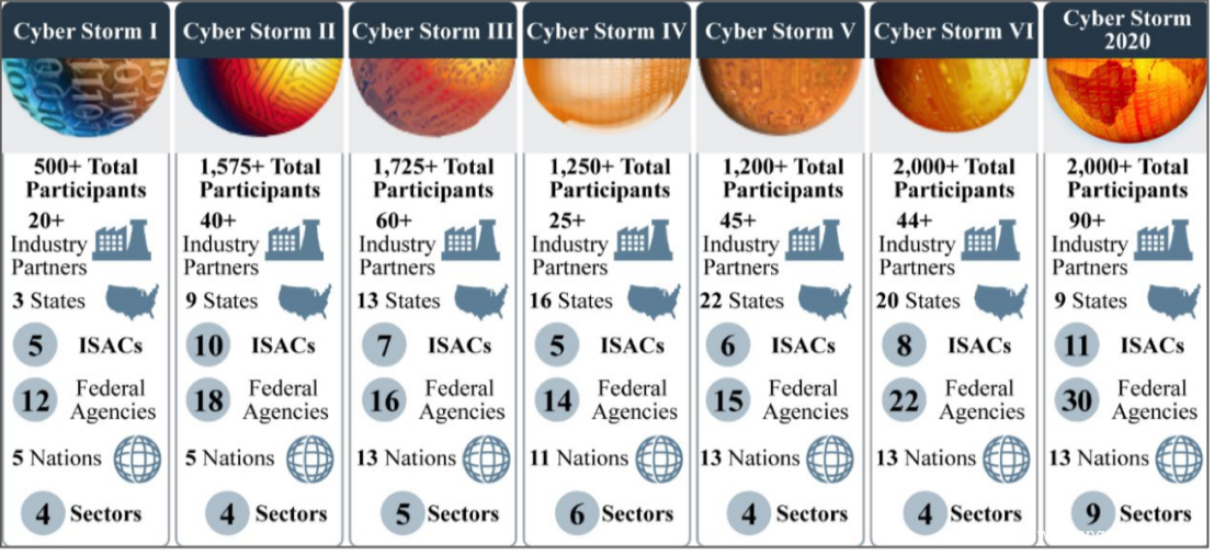 美国网络风暴演习是隶属于DHS的CISA组的攻防演习。由图3可以看出来整个参与群体与规模越来越大,参与的州、威胁情报中心、联邦机构、国家、行业也越来越多,参加的合作伙伴也越来越多,这里面应该都是美国的各种安全厂商。网络风暴演习以威胁情报中心作为主体,并会涉及相关的其他国家(主要来自于IWWN组织)一起进行演习。